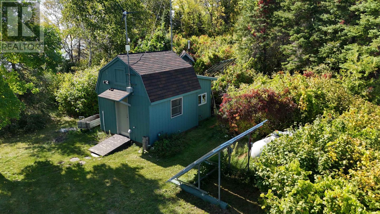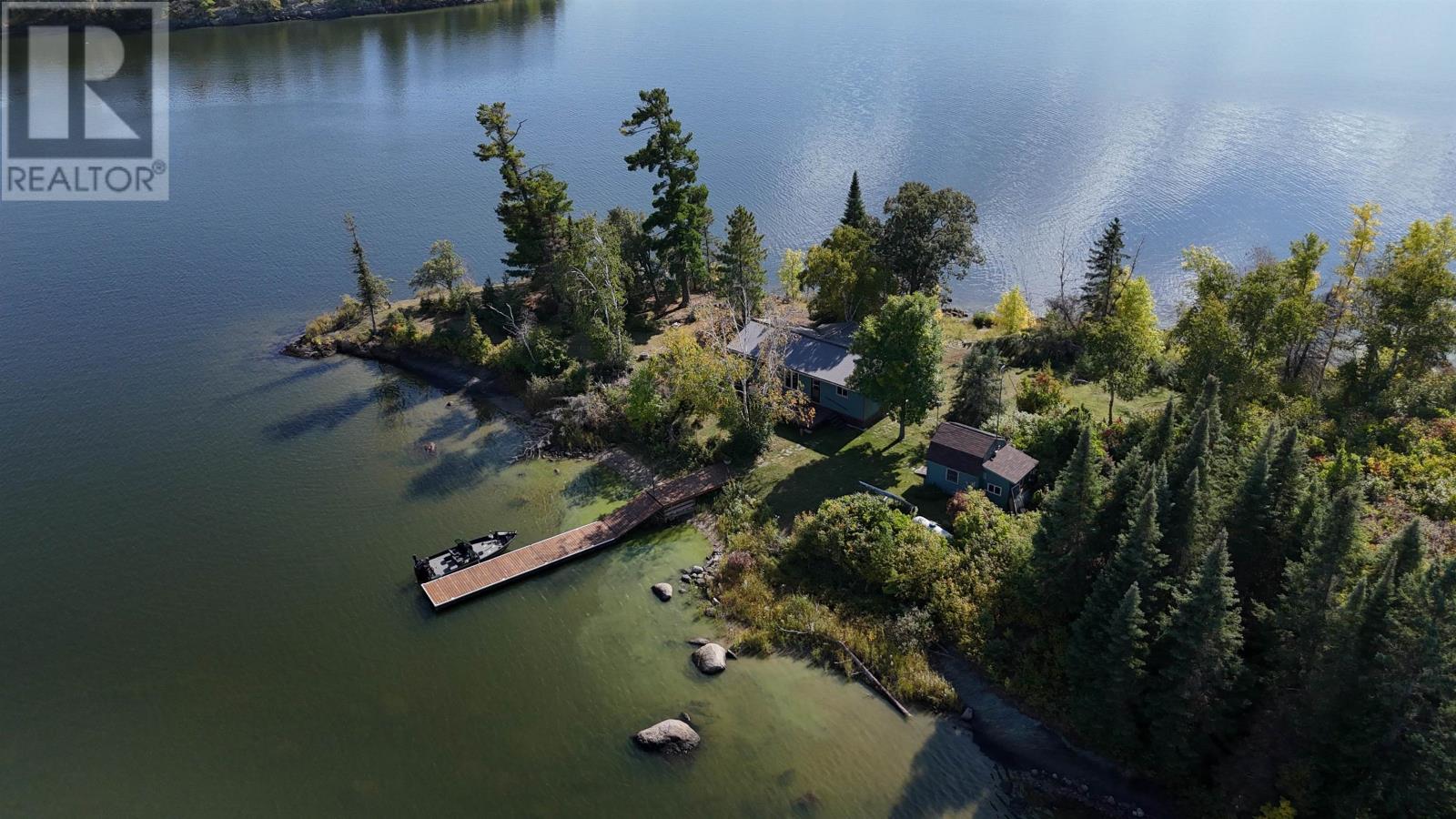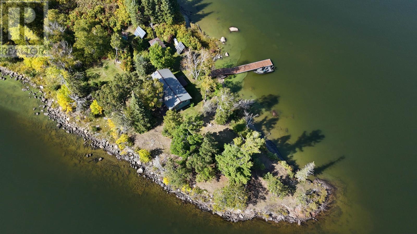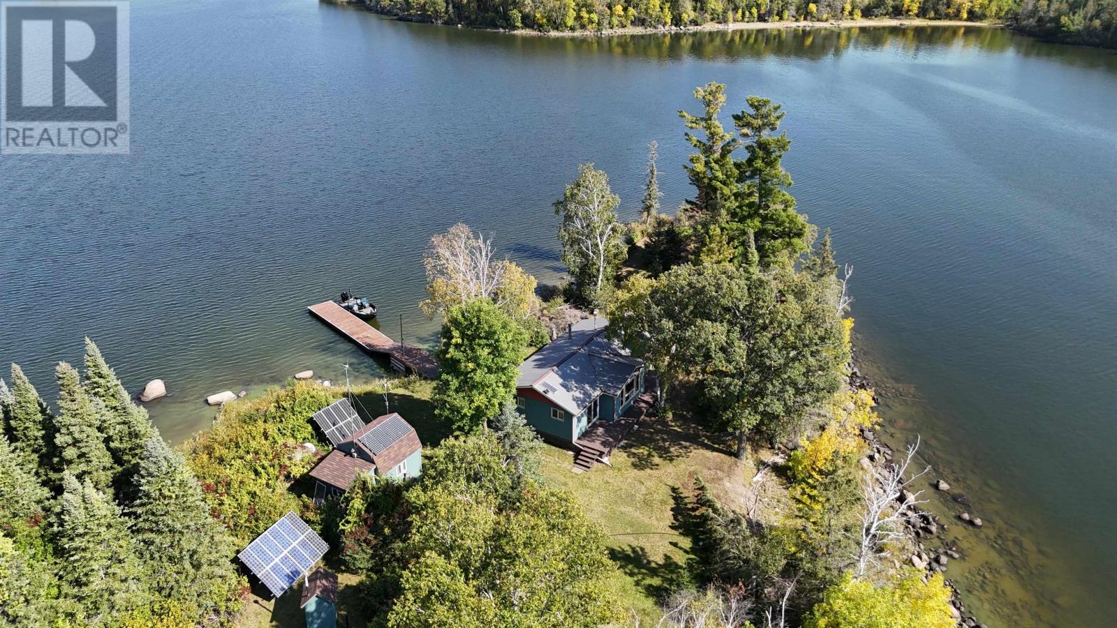 Surrounded by water on nearly all sides, this rare offering boasts 1,161 feet of frontage with almost 360° of waterfront views. Set on 2.1 acres of titled land in unorganized territory, this is the ultimate private retreat on the desirable east side of Ptarmigan Bay. Enjoy the convenience of a new sheltered dock, framed by sandy beaches on both sides, perfect for swimming, boating, and lakeside relaxation. The cottage itself is thoughtfully designed and well maintained, sitting on a poured concrete foundation with newer siding, windows and steel roof, ensuring low maintenance for years to come. Modern off-grid living is made easy with a sophisticated solar power system, featuring multiple solar panels and wind turbines, delivering enough energy for everyday comforts including heat, air conditioning, fridge, microwave, and more. This unique point property offers unmatched privacy, breathtaking views, and everything you need to start enjoying lake life right away. (id:4069)