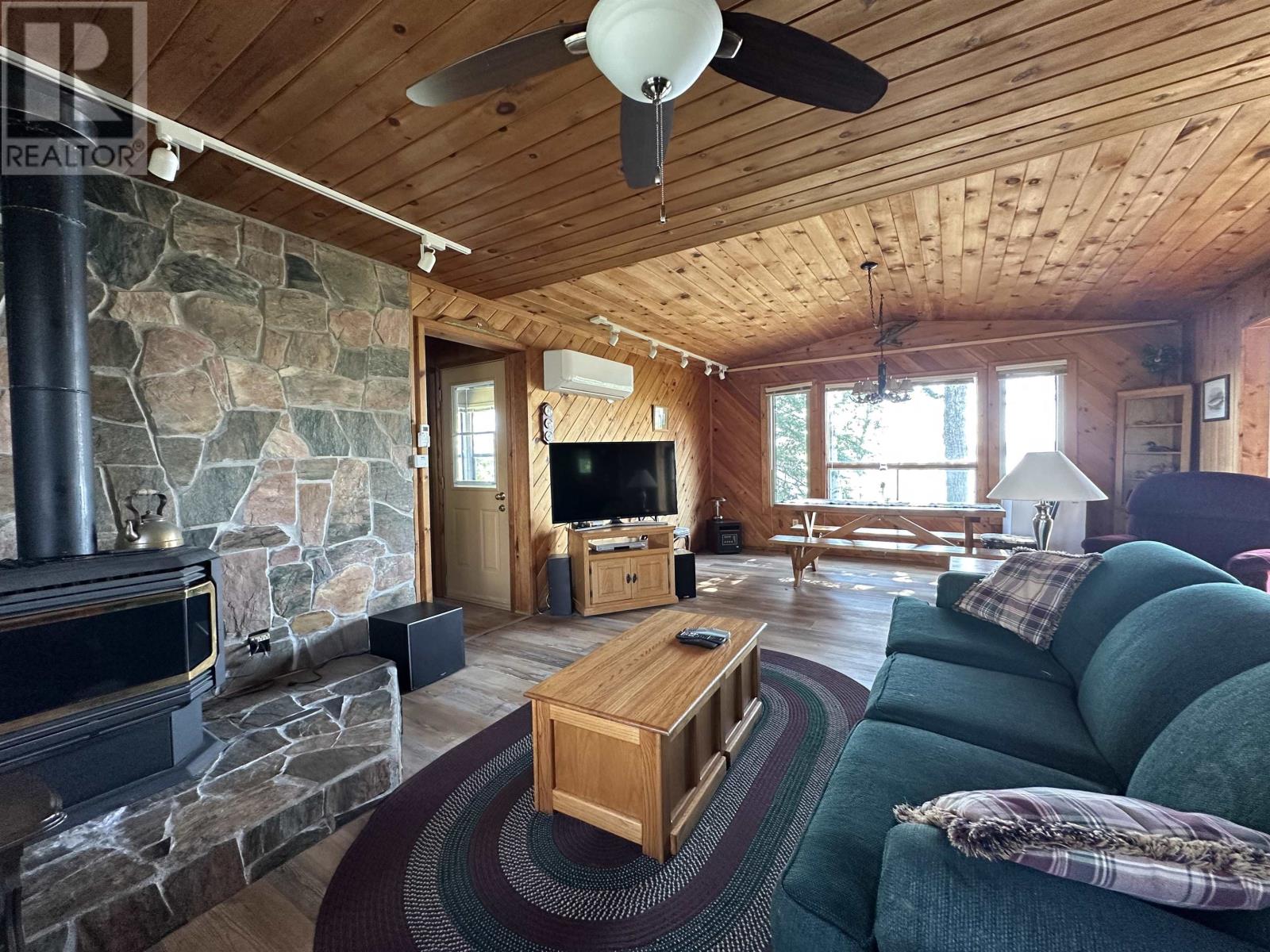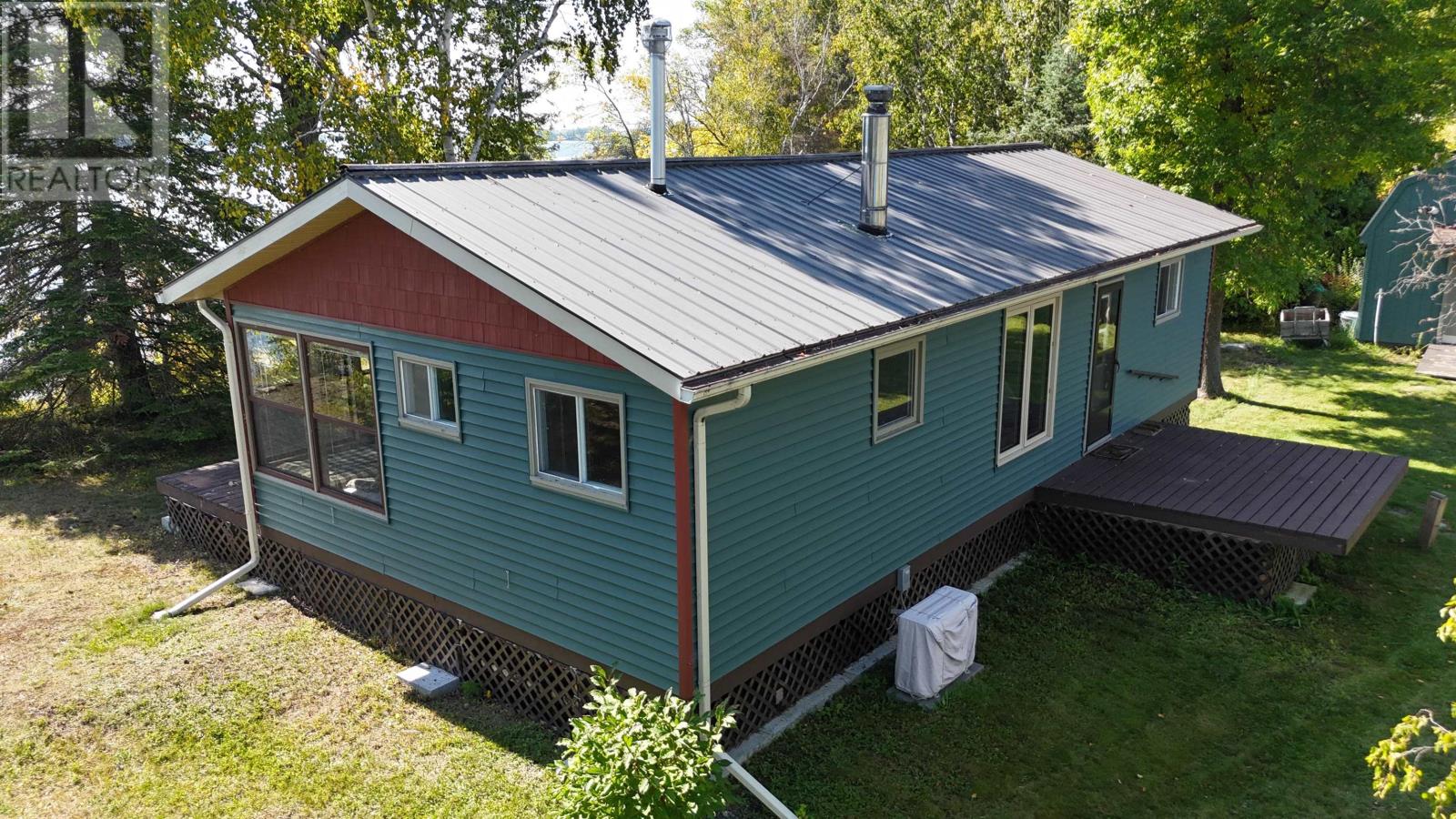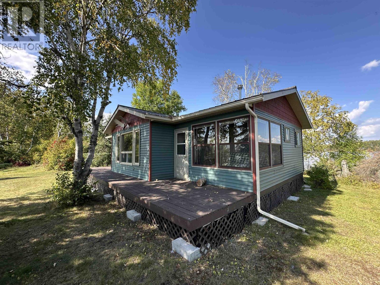 Surrounded by water on nearly all sides, this rare offering boasts 1,161 feet of frontage with almost 360° of waterfront views. Set on 2.1 acres of titled land in unorganized territory, this is the ultimate private retreat on the desirable east side of Ptarmigan Bay. Enjoy the convenience of a new sheltered dock, framed by sandy beaches on both sides, perfect for swimming, boating, and lakeside relaxation. The cottage itself is thoughtfully designed and well maintained, sitting on a poured concrete foundation with newer siding, windows and steel roof, ensuring low maintenance for years to come. Modern off-grid living is made easy with a sophisticated solar power system, featuring multiple solar panels and wind turbines, delivering enough energy for everyday comforts including heat, air conditioning, fridge, microwave, and more. This unique point property offers unmatched privacy, breathtaking views, and everything you need to start enjoying lake life right away. (id:4069)